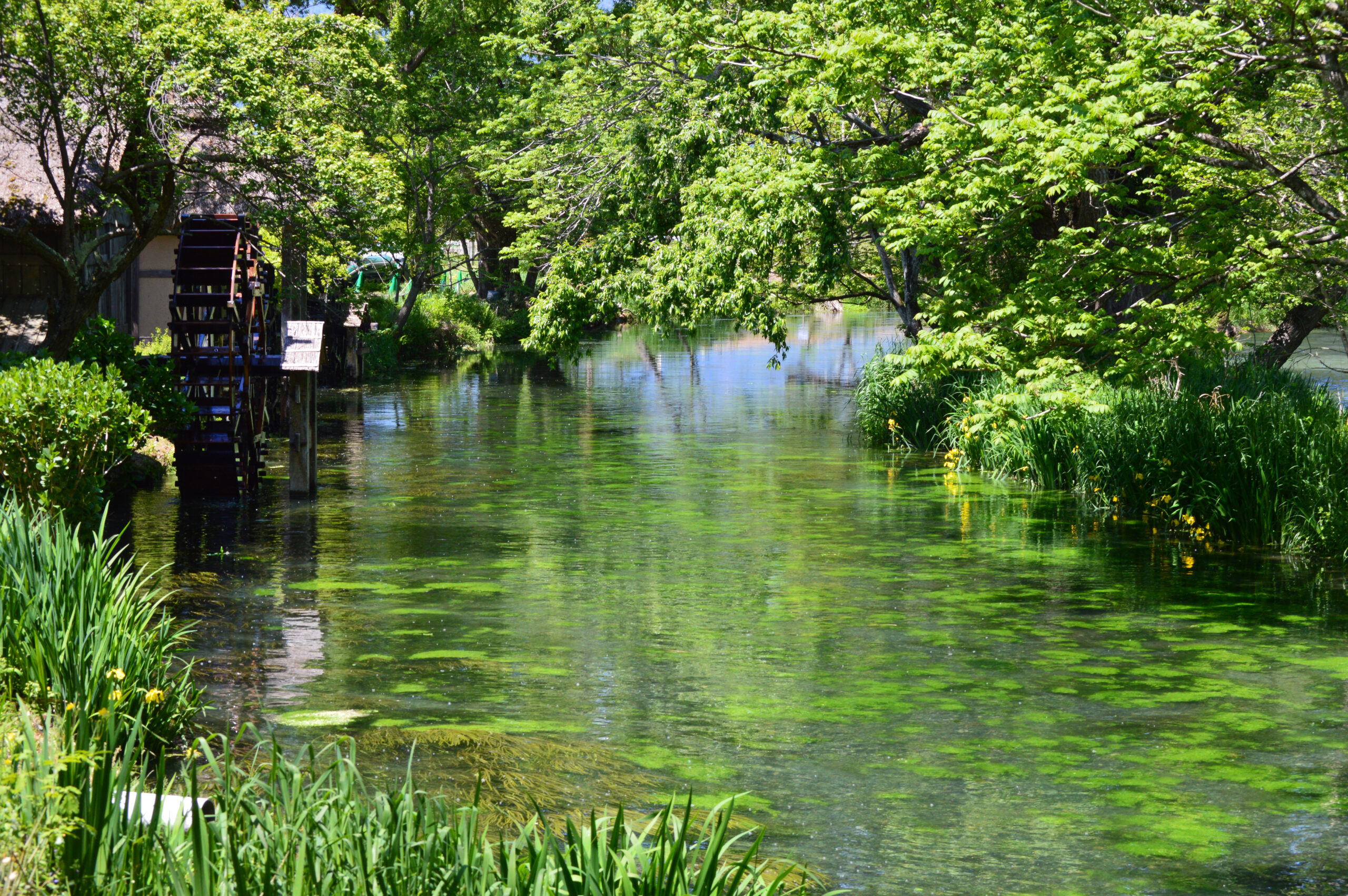 ツアーの途中では、わさび農園の水車小屋に立ち寄ったり、中州で水遊びや水生物探しをしたり。